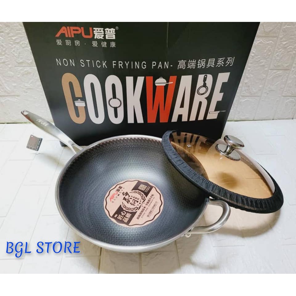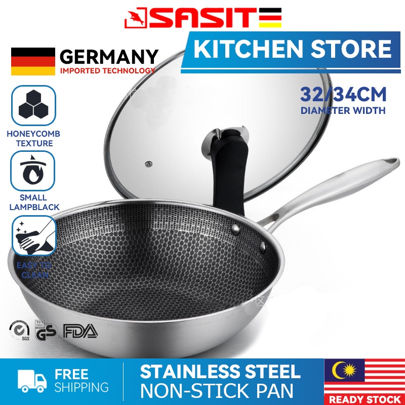High Quality 304 Stainless Steel Honeycomb Non Stick Surface Cooking Wok With Glass Cover Kuali Non Stick Shopee Malaysia